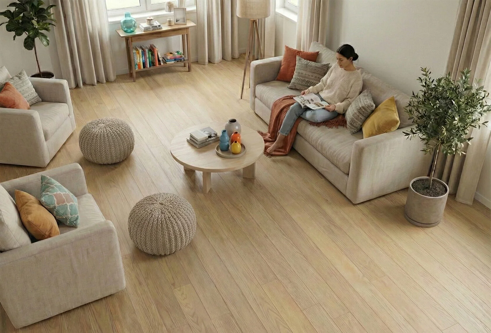💡 Совет от экспертов Floor Fort: в светлых песочных оттенках особенно ценится естественная асимметрия рисунка. Не сортируйте планки по тону — позвольте декору естественно перетекать от более светлых к насыщенным элементам. Укладка вразбежку подчеркнёт глубину фактуры и создаст эффект паркета ручной работы.