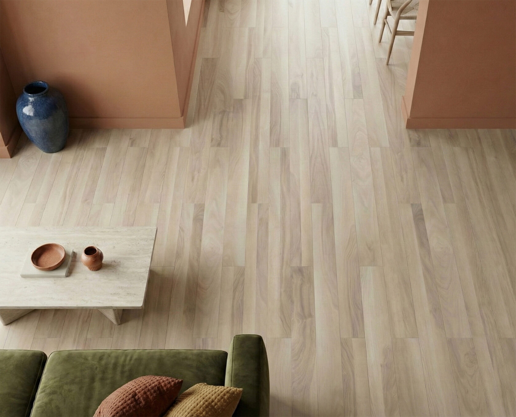 Технические характеристики профессионального уровня Покрытие относится к 33 классу износостойкости по стандарту EN 13329, что гарантирует устойчивость к интенсивным нагрузкам в жилых, офисных и коммерческих помещениях. Основа из высокоплотной HDF-плиты (плотность 890 кг/м³) обеспечивает стабильность геометрии, эффективное шумопоглощение и сопротивление деформациям — этот показатель на 50% выше, чем у стандартного ламината. Толщина панели 10 мм позволяет выполнять бесшовную стыковку с керамогранитом и плиткой без использования переходных порожков.